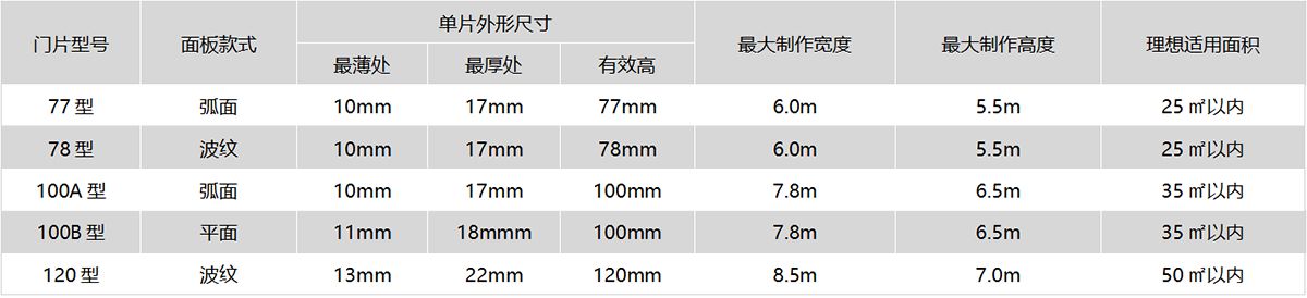 門體款式:門體正面造型可為:弧形、平面、波紋、平條、蜂窩孔等,單片高度可為:77、78、100、120mm;