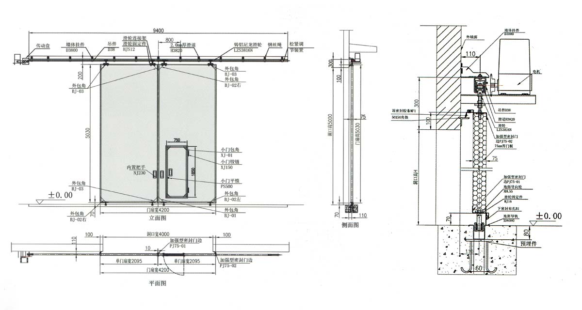 華建工業電動平移門根據現場土建情況的不同可設計為上承重下導向、 下承重上導及上下承重導向的運行結構,通過齒條、皮帶、鏈條或鋼繩等傳動,實現門體水平分析左右平移啟閉;可單扇平移、雙扇平移、多扇平移。運行平穩壽命長,電動、手動安全可靠,可實現單樘面積上百平米的超大門;適用于門洞縱向方向無太多安裝空間而橫向方向滿足安裝空間的工業用門;門體可采用彩鋼板、鋁板、不銹鋼板及鋼結構組合等材質及方式,門扇上可設計門中門、窗戶,采用開門機驅動實現門體左右直線運動;華建工業平移門兩側和頂面采用三元乙丙橡膠條密封,密封性能優越,停電后可手動開啟或關閉門體;開關門運行速度0.1~0.2米/秒。