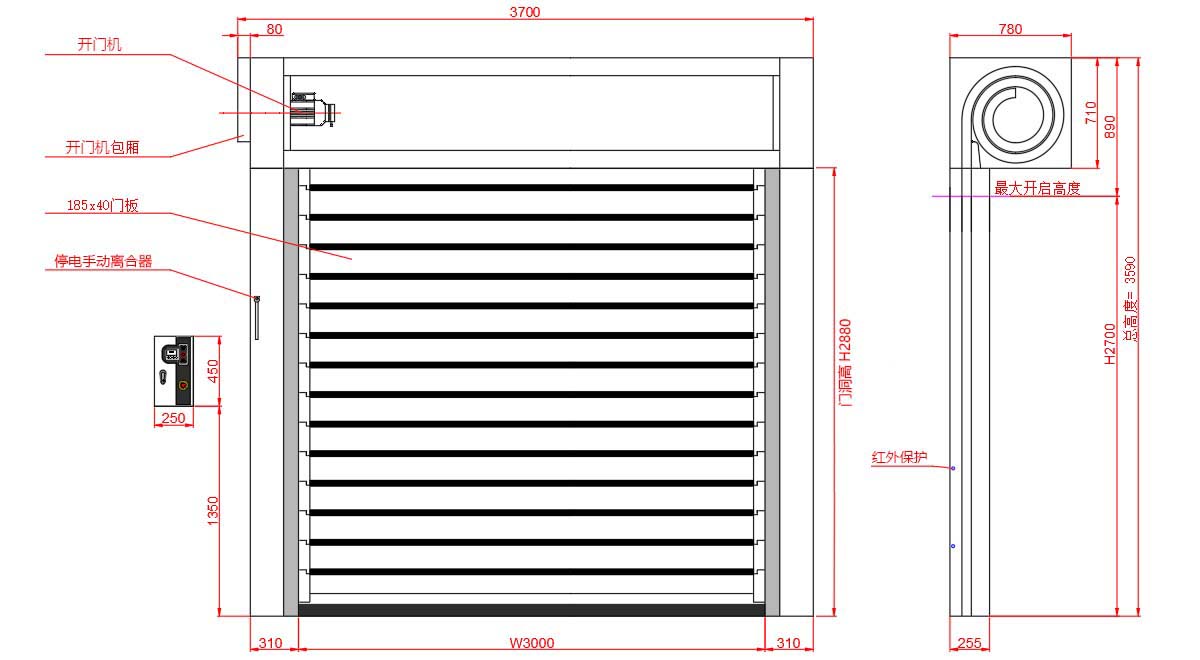 快速硬質(zhì)門的安裝土建結(jié)構(gòu)要求相對(duì)簡(jiǎn)單,根據(jù)產(chǎn)品各處尺寸及實(shí)際安裝工藝方法確定快速硬質(zhì)門安裝對(duì)土建結(jié)構(gòu)尺寸的要求為:門洞兩側(cè)寬度空間≥310㎜(但應(yīng)有安裝控制器的位置)、安裝電機(jī)處寬度空間≥390㎜、安裝卷軸處高度空間≥650-1000㎜(實(shí)際尺寸根據(jù)門洞高度調(diào)整)。