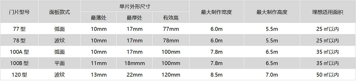2.5 門體:根據不同的門洞規格及開門機選型,配置相應的77㎜、80㎜、90㎜、100㎜、120㎜的雙層鋁合金門體,應滿足門的不同要求,總體要有足夠剛性和強度;